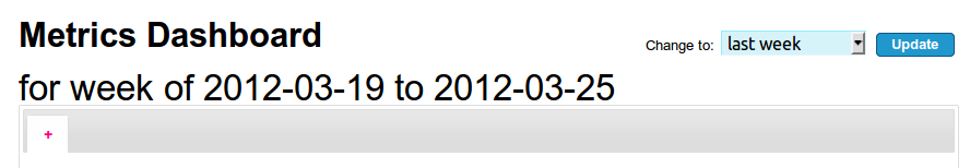 Integrated in Tiki5, and initially developed as part of the Support Mozilla project, the metrics dashboard allows the administrator of a site to configure metrics to be tracked over time, by means of tiki-metrics.php. The site editors can then use these metrics to investigate changes in usage.
