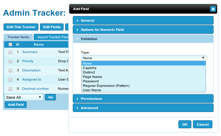 When editing or adding a tracker field while configuring a tracker, you can choose a validation option: